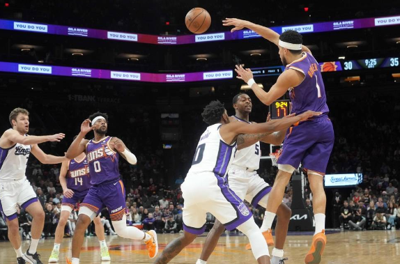 開場(chǎng)后太陽(yáng)外線連續(xù)三分取得領(lǐng)先,國(guó)王在逐漸找到手感后將比分追上,第二節(jié)國(guó)王和太陽(yáng)輪番打出小高潮,在半場(chǎng)結(jié)束前太陽(yáng)在布克的帶領(lǐng)下一波13-3的攻勢(shì)建立領(lǐng)先。易邊再戰(zhàn),太陽(yáng)進(jìn)攻斷電,國(guó)王趁勢(shì)追擊在第三節(jié)打了個(gè)33-12完成反超。末節(jié)太陽(yáng)努力追分,但他們兩次惡意犯規(guī)打斷自己追分勢(shì)頭,??怂乖俅未虺瞿┕?jié)殺手的表現(xiàn),他連連砍分幫助國(guó)王鎖定勝局,最終國(guó)王114-106逆轉(zhuǎn)送給太陽(yáng)2連敗。